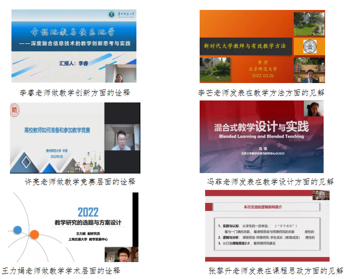 本次线上研修活动顺次听取了华中师范大学的李睿老师在教学创新、北京师范大学的李芒老师在教学方法、贵州师范大学的许亮老师在教学竞赛、北京大学的冯菲老师在教学设计、上海交通大学的王力娟老师教学学术、上海中医药大学的张黎升老师在课程思政方面的优秀见解与诠释。同时,参加研修活动的老师就教育教学过程中出现的问题与每位老师进行了互动交流。